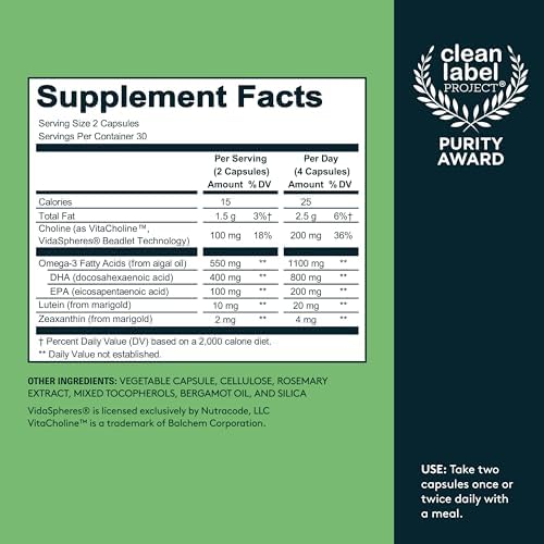 Dosed at 500mg of Omega-3(DHA+EPA), 100mg of Choline, 10mg of Lutein, and 2mg of Zeaxanthin.